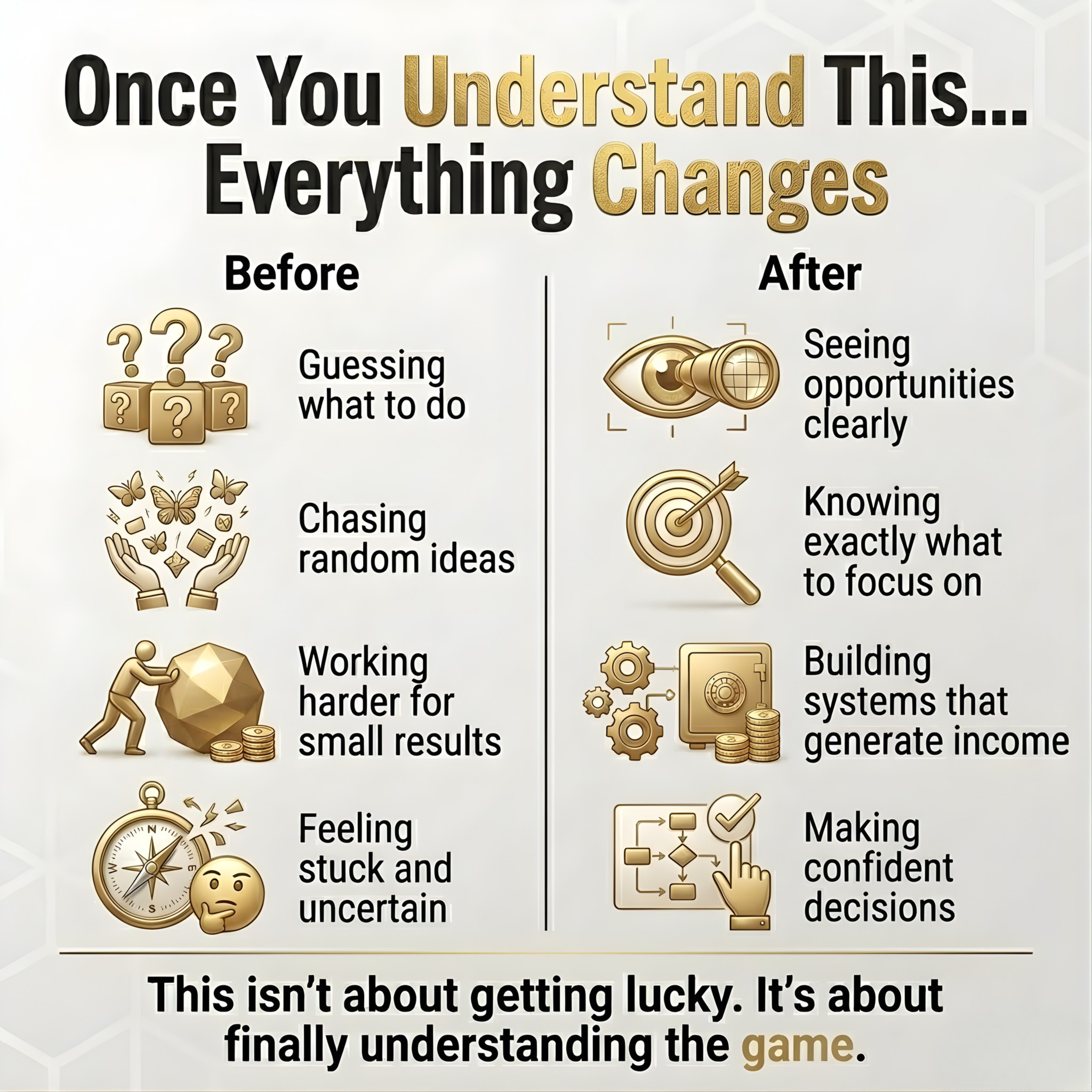 Most people are just trying things and hoping something works. That’s why they stay stuck. Once you understand how money actually works, you stop guessing and start making clear decisions.